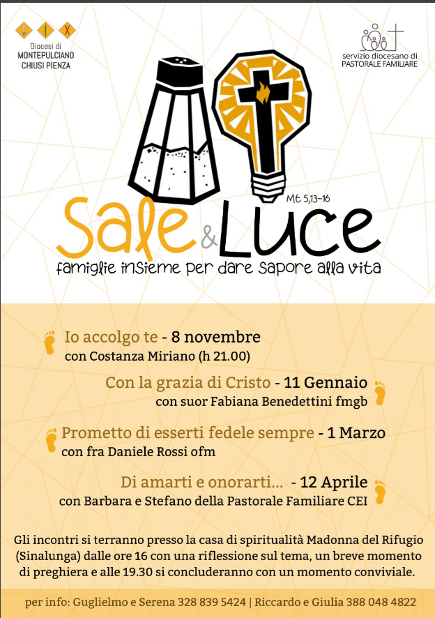 Si chiama “Sale e luce!” il un nuovo progetto di Pastorale Familiare diocesana. Il primo incontro, l’8 novembre 2025, apre un ciclo pensato per coppie di sposi e famiglie per riscoprire la bellezza del matrimonio e della vita familiare alla luce della fede.