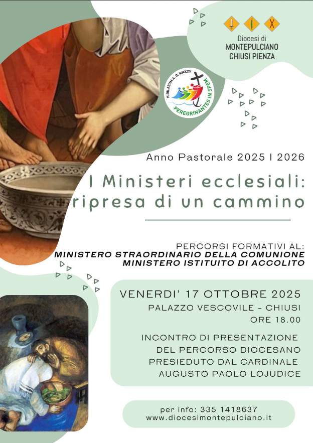 Venerdì 17 ottobre 2025, alle ore 18, presso il palazzo vescovile di Chiusi, si terrà l’incontro –  presieduto dal card. Augusto Paolo Lojudice -“I ministeri ecclesiali: ripresa di un cammino”.