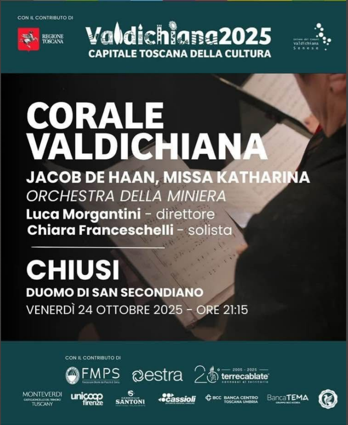 Venerdì 24 ottobre 2025, alle ore 21,15, nel Duomo di San Secondiano a Chiusi, si terrà il concerto “Missa Katharina” di Jacob De Haan con la Corale della Valdichiana e l’Orchestra della Miniera. Direttore Luca Morgantini, Solista, Chiara Franceschelli.