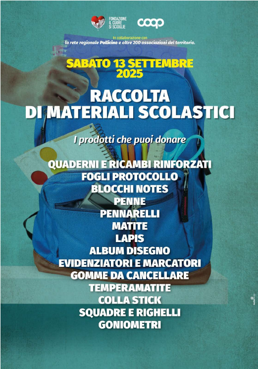 Domani, sabato 13 settembre 2025, la Fondazione “Il Cuore si Scioglie”, in collaborazione con UniCoop Firenze e le Caritas della Toscana, organizza una raccolta straordinaria di materiale scolastico destinata ai bambini e ai ragazzi delle famiglie fragili del territorio. Lo slogan è “Insieme possiamo fare la differenza e garantire una solidarietà spesa bene anche a scuola”.