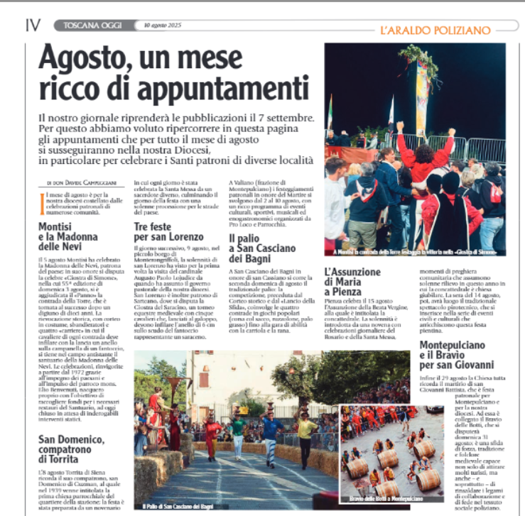 IL MESE DI AGOSTO RICCO DI CELEBRAZIONI PATRONALI IN TUTTA LA DIOCESI. SULL’ARALDO POLIZIANO IL FOCUS
