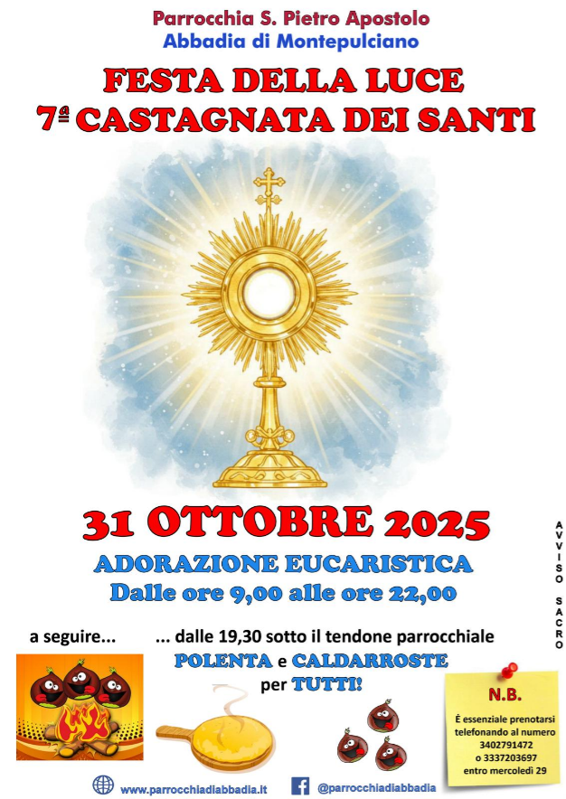Venerdì 31 ottobre 2025, ad Abbadia di Montepulciano, si terrà “La festa della Luce. VII Castagnata dei Santi” promossa dalla parrocchia S. Pietro Apostolo. Inoltre, il 31 ottobre dalle ore 9 alle ore 22 si terrà l’Adorazione Eucaristica.
