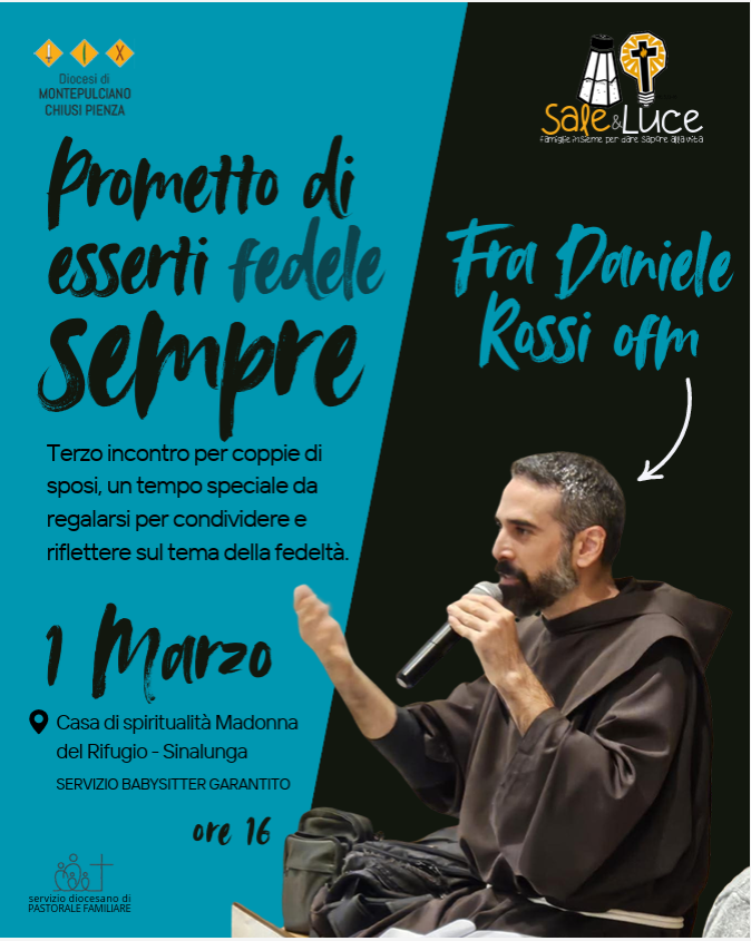 Manca pochissimo al terzo dei 4 incontri per coppie di sposi! Domenica 1 Marzo 2026, con l’aiuto di fra Daniele Rossi ofm, un’altra occasione per coppie di sposi per camminare insieme ad altre famiglie e donarsi reciprocamente del tempo di qualità!