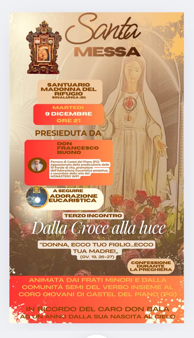 Predicate da Don Francesco Bono, parroco di Castel del Piano (PG), le catechesi si tengono ogni primo martedì del mese (eccezion fatta per l’appuntamento di dicembre) presso il Santuario Madonna del Rifugio a Sinalunga (SI).