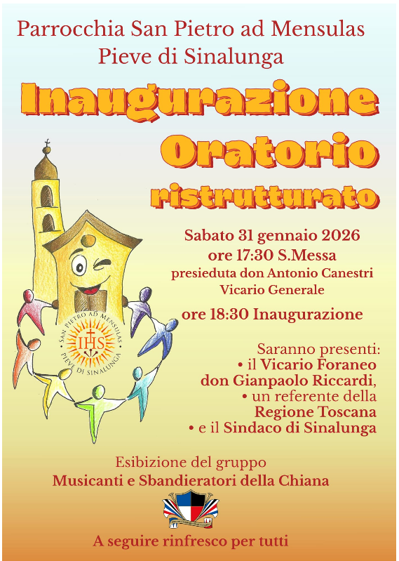 Sabato prossimo, 31 gennaio 2026, si terrà la cerimonia d’inaugurazione dei lavori di ristrutturazione dell’oratorio della parrocchia San Pietro ad Mensulas alla Pieve di Sinalunga. Il programma prevede alle ore 17,30 la Santa Messa presieduta dal vicario generale, Don Antonio Canestri, alle ore 18,30 l’inaugurazione dei lavori dell’oratorio.