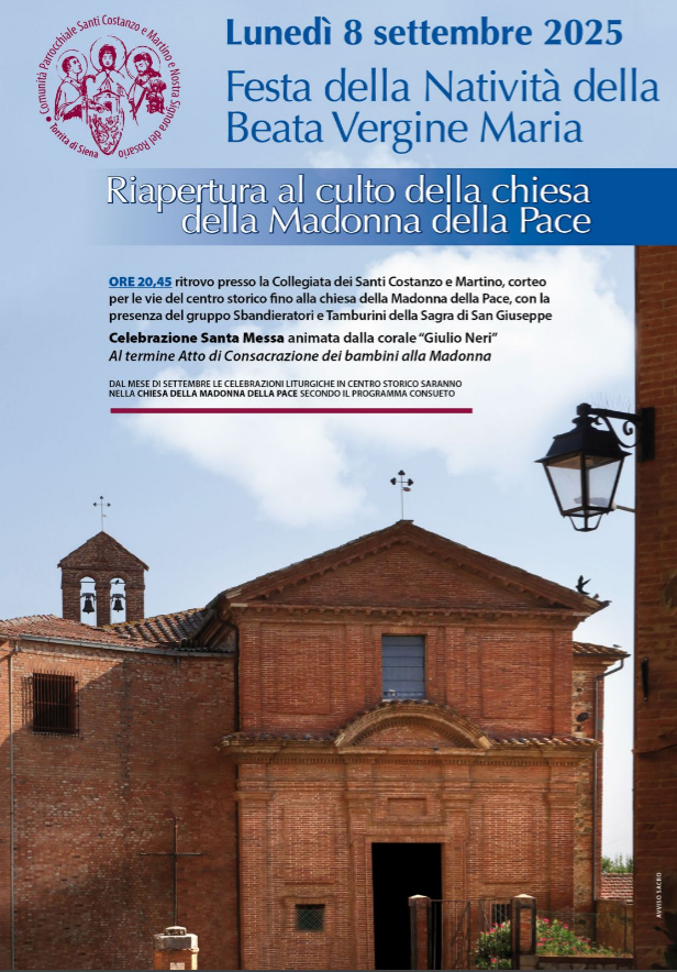 Oggi, lunedì 8 settembre 2025, in occasione della Festa della Natività della beata Vergine Maria, si terrà la cerimonia per la riapertura al culto della chiesa della Madre della Pace a Torrita di Siena.